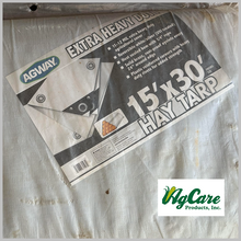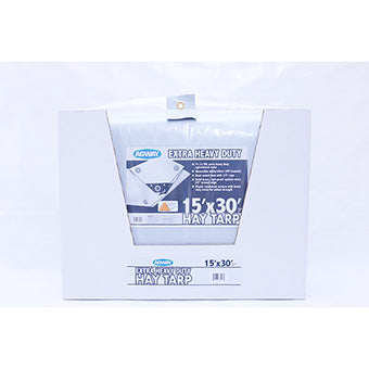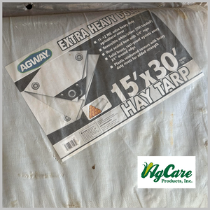 Agway brand agricultural cover hay tarp, but has many other uses. It can be used to cover farm equipment, a leaking roof, or any other applications where a heavy duty cover is required. It is a thick, durable 6 oz. per sq. yard (equivalent to 11-12 mil), 14X14 mesh, white on one side and silver on the other to reflect sunlight, brass eyelets about every 2 feet, reinforced hard plastic corners, with 1/4 rope around the heat sealed hem.