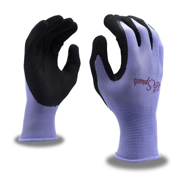 Sprouts Weeder machine-knit, gardening gloves are form-fitting and puncture-resistant.  Provides excellent gripping power for a variety of lawn and garden applications.  Nitrile coated palm is an oil-resistant, synthetic rubber that is abrasion-, snag-, and puncture-resistant.  Color purple/black.  Size medium
