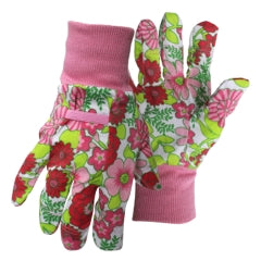 Start out your gardening session with these fun floral gardening gloves - Let the cheery colors inspire you to grow beautiful flowers, tasty vegetables and attack those pesky garden weeds that seem to crop up daily. Colorful 100% cotton w/reinforced fingertips Added protection and longer wear Knit wrist keeps dirt and debris off hands No coating or sure-grip PVC dots