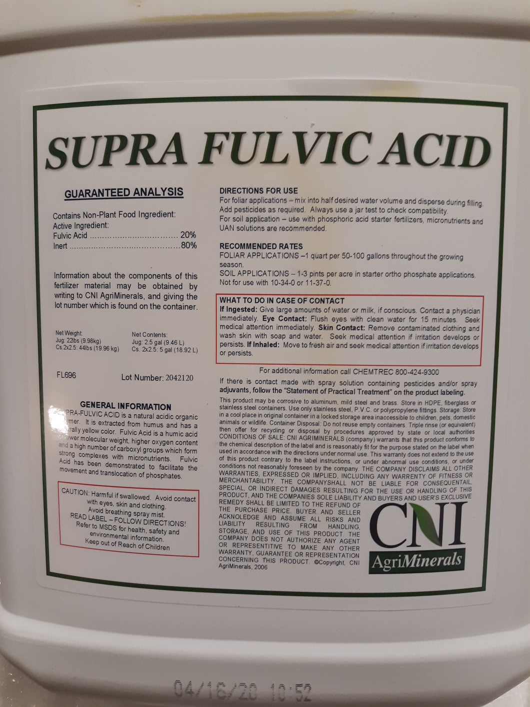 Supra - Fulvic Acid 20% Fulvic 2.5 gal Replacement for BioChar and Carbon. A natural acidic organic polymer. Extracted from humus and has a naturally yellow color. Fulvic Acid is a humic acid of lower molecular weight, higher oxygen content and a high number of carboxyl groups which form strong complexes with micronutrients. Fulvic Acid has been demonstrated to facilitate the movement and translocation of phosphates.