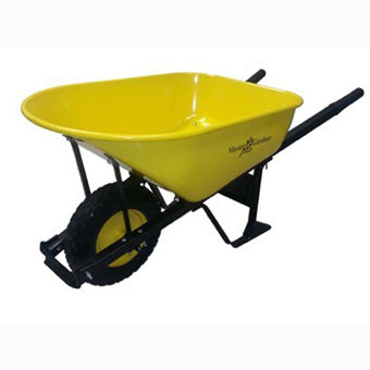 6 cubic foot capacity. Steel Tray. Metal Handles with a comfort grip. Flat-free tire.