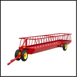 The Farmco Silage Feeder Wagon allows you to feed in different locations and fill your feeder at the point of your silage pit. This unit is 47" wide and 20' long. It has 15x6 rims and used tires. Made from 12 guage metal with reinforcements at critical spots. High quality welds and paint applied electrostatically for an even lasting finish. Slanted trough sides for less feed waste. A 180 degree turning front dolly for easy drivability. An extended tongue that folds up and hooks while in use for feeding. Hauls more than the economical 2 wheeled models. CF420 model